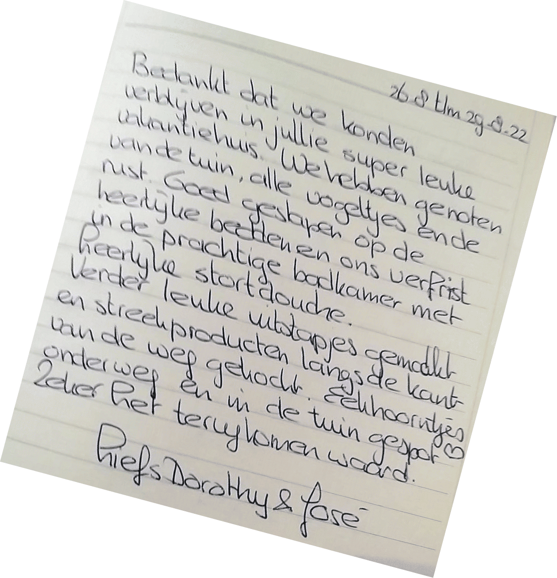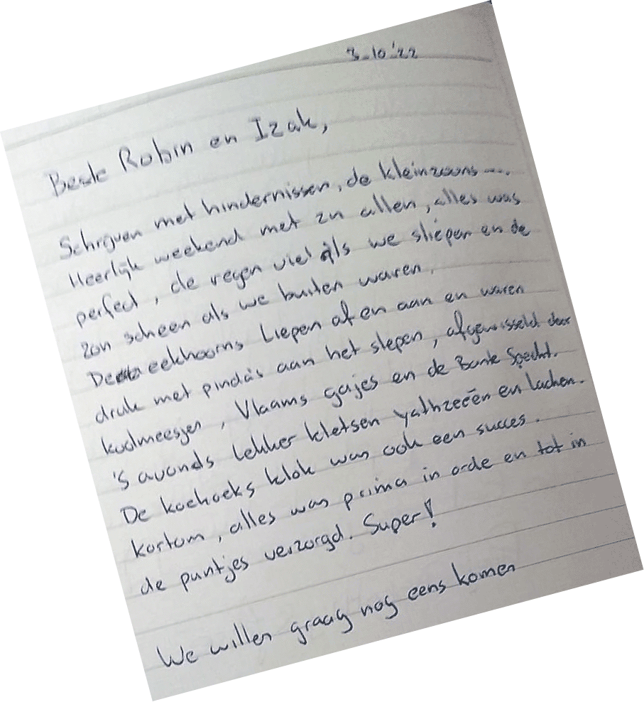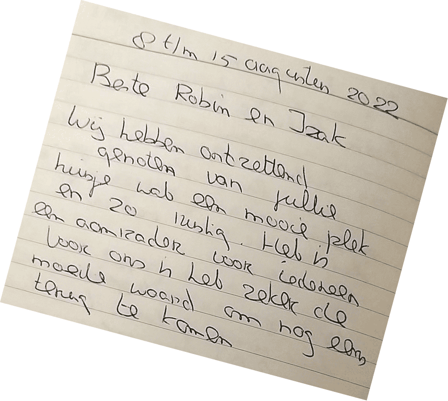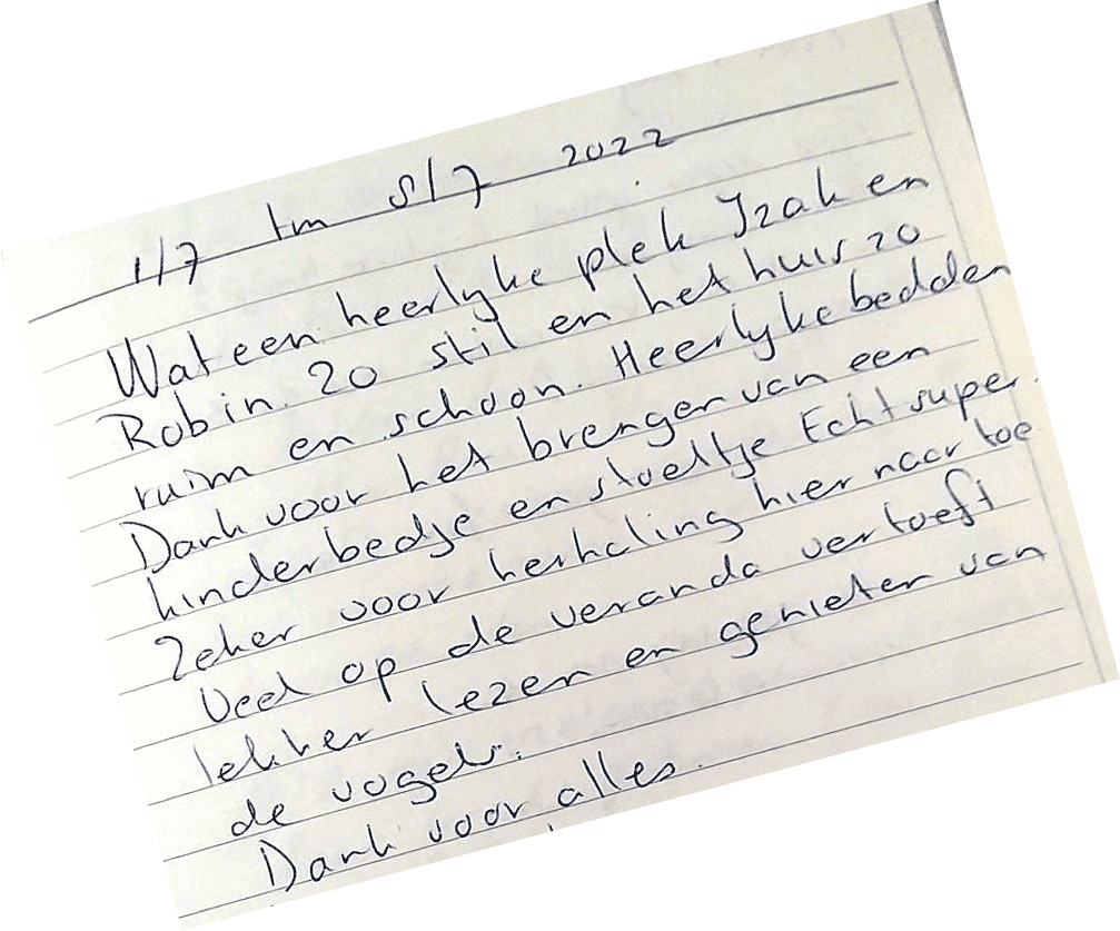 Bedankt voor een heerlijk widweekje in jullie huisje.